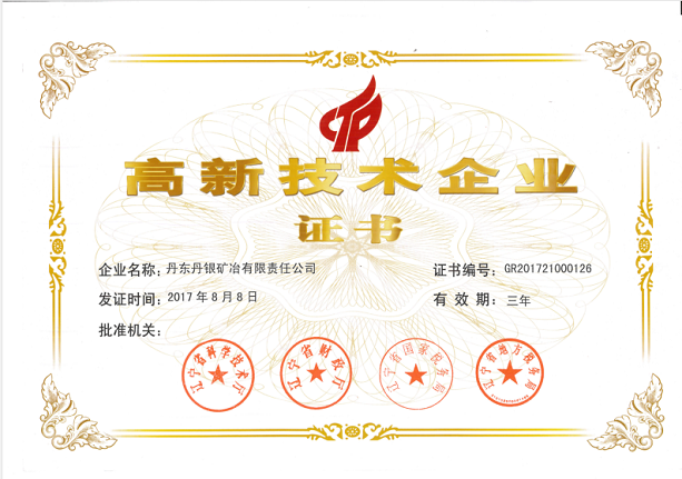近日,辽宁省科技厅、财政厅、国家税务局、地方税务局向丹东丹银矿冶有限责任公司颁发《国家高新技术企业证书》,标志着丹东丹银矿冶有限责任公司正式成为国家高新技术企业。
